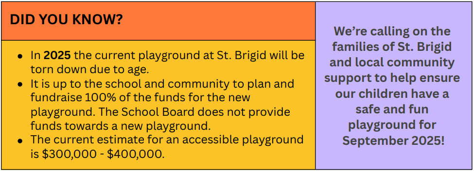Donate New playground needed at St. Brigid! Fundraising Tracker Created using the Donation Thermometer plugin https://wordpress.org/plugins/donation-thermometer/.$400,000.00Raised $256,302.00 towards the $400,000.00 target.$256,302.00Raised $256,302.00 towards the $400,000.00 target.64.08% Help raise funds! donate Join us for the next playground meeting: October 9th, 2025 at 6:00 pm and Playground meeting to follow after AGM.
